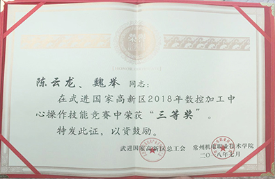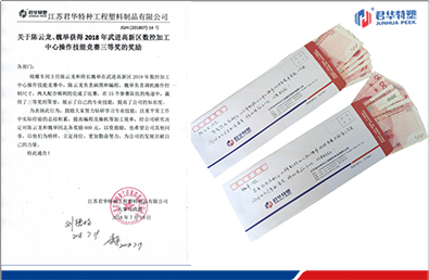 我司加工車間主任陳云龍和班長魏舉果然不負(fù)眾望,榮獲三等獎,并由常州機(jī)電職業(yè)技術(shù)學(xué)院的馬院長親自頒發(fā)證書。同時也為江蘇君華特種工程塑料制品有限公司贏得了這份榮譽。